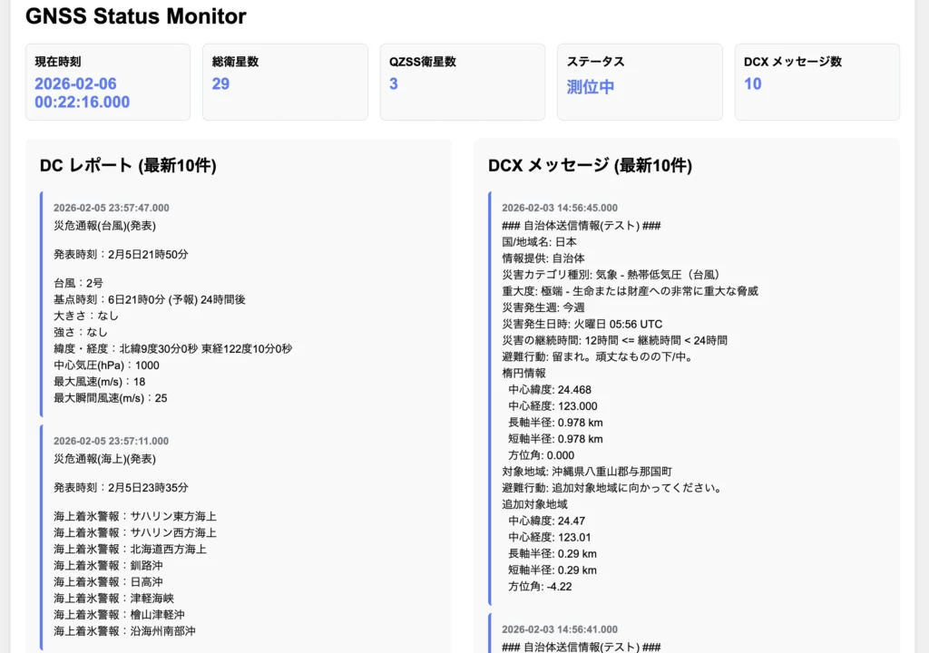 添付のPDFを見る限り、これは準天頂衛星「みちびき」経由で配信される災害・危機管理通報(DCレポート)や、より詳細な自治体送信情報(DCXメッセージ)を受信して一覧表示したログですね。