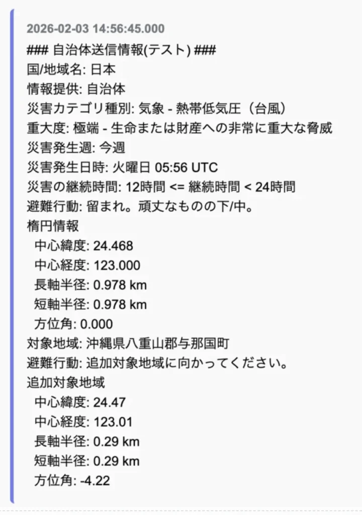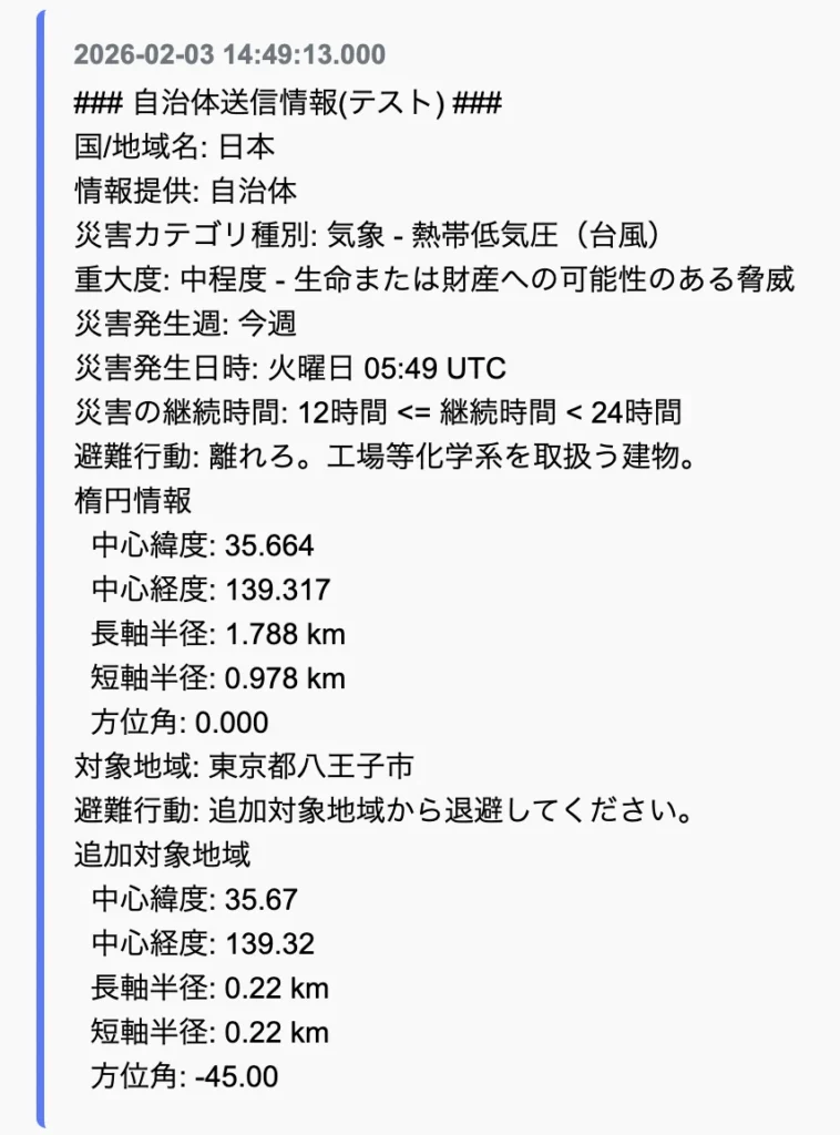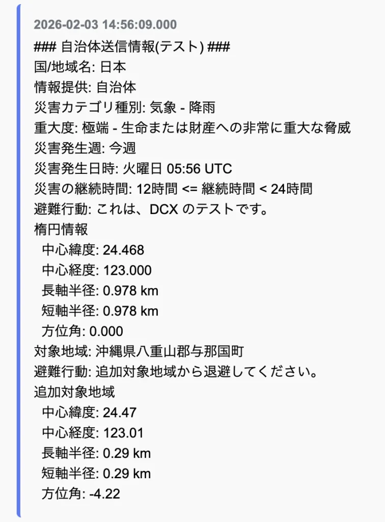 DCXの例では、対象地域(例:与那国町、堺市、八王子市など)と、重大度、継続時間、そして「避難行動」文言、さらに楕円(中心緯度経度+半径など)で範囲が付いています。