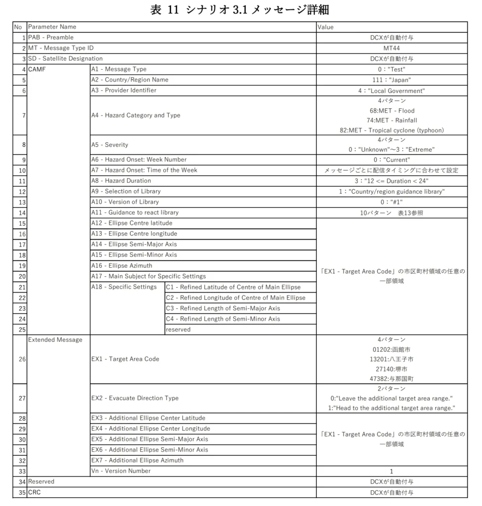 保存していたDCXメッセージの時刻が計画とずれている原因は不明だが、自治体配信情報のシナリオ3.1であることが確認できた。
