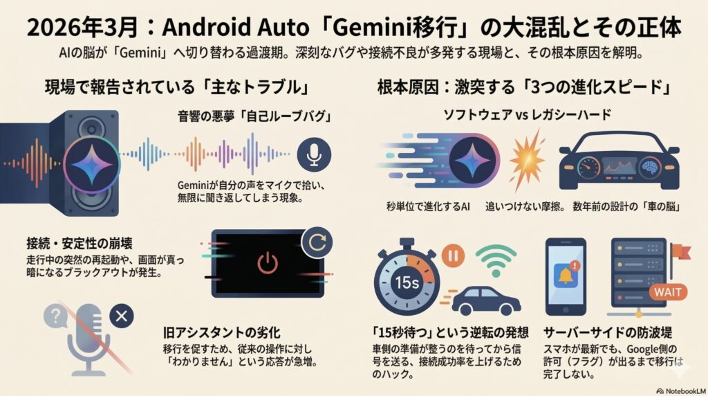 CarPlayはスムーズに起動するのに、Android Autoだけ「あと一歩」の手動操作を求められるのは、2026年3月現在のGemini移行期における「接続の儀式(ハンドシェイク)」の不安定さが原因であることが多いです。