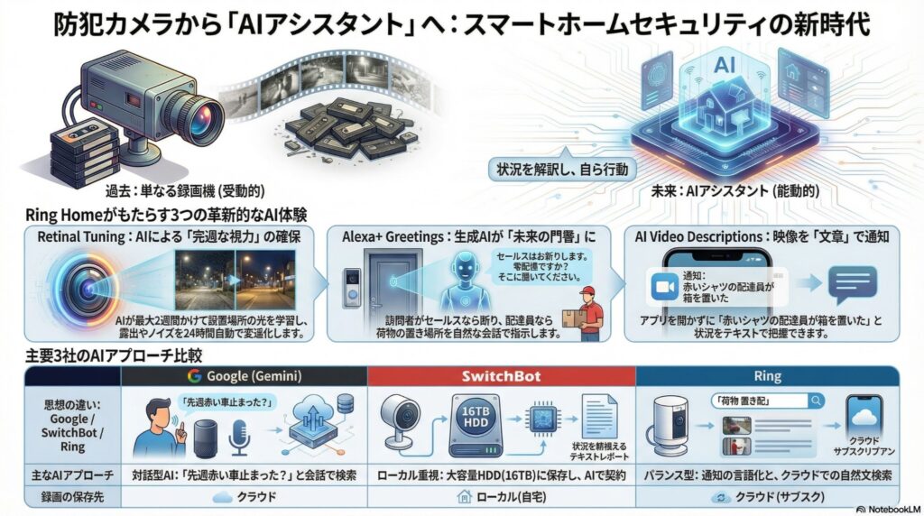 - 分析(説明)は AI Video Descriptions で通知の情報密度を上げる方向(“アプリを開かず理解”)。(Ring)