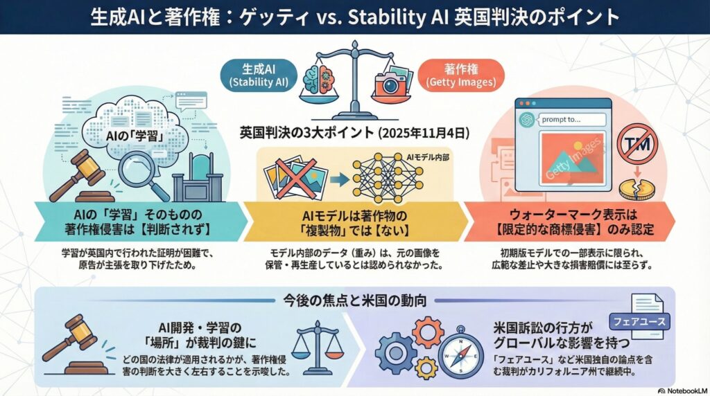 さらに、Stability側は当初から学習は英国外のAWSクラスター上で行われたと述べていた、と整理されています。(Courts and Tribunals Judiciary) - 実務解説でも、「入力(学習)クレームは、英国域内での複製行為を示す証拠が不足したため、審理終結時に取り下げられた」と要約されています。(Farrer & Co.)