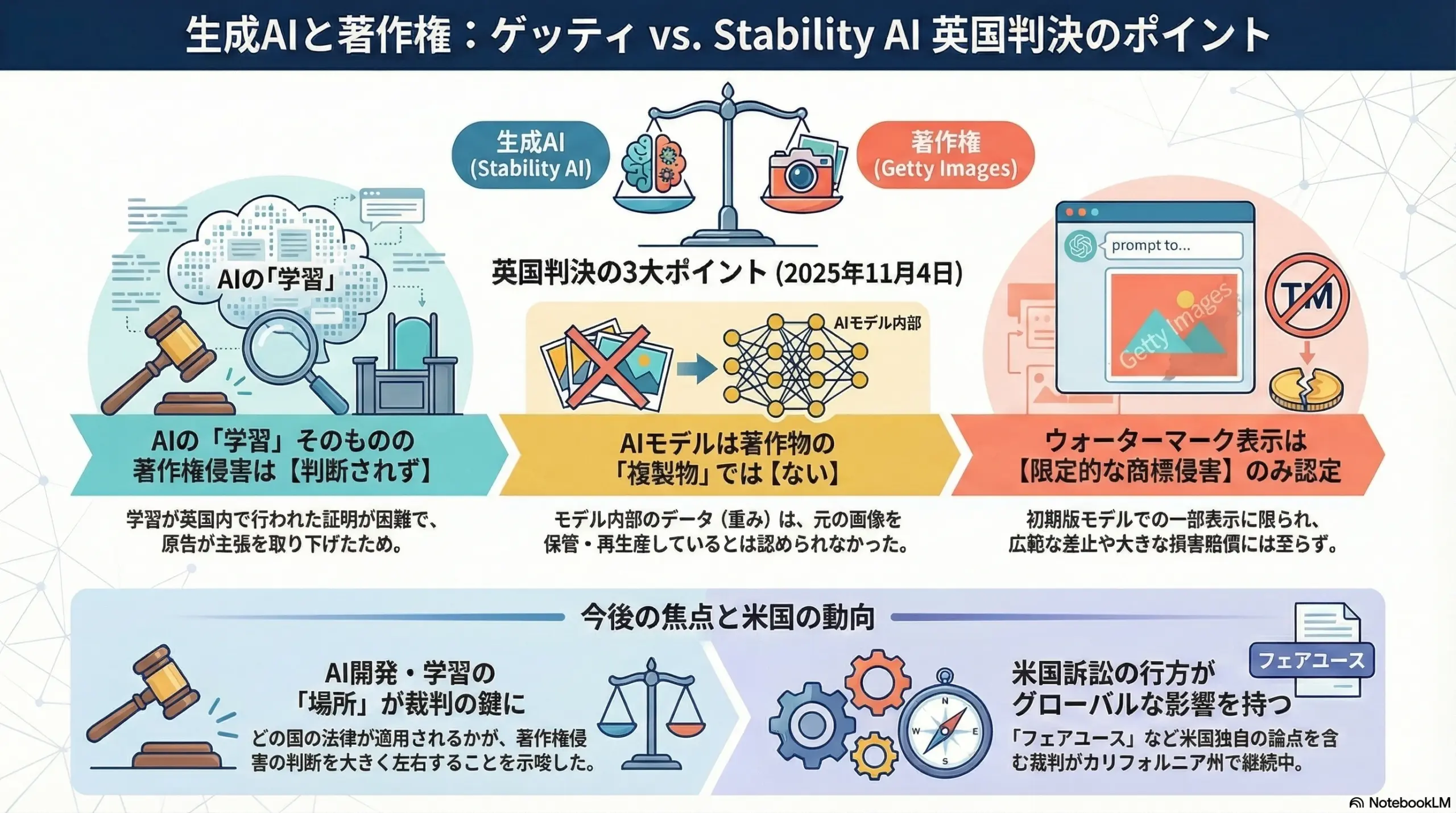 AI学習の地理的所在や管轄の選択が、今後も大きな争点になります。 (AP News) - モデル内部表現の法的評価:英国判決は、モデルが“著作物の複製”を内部に保持しているとは言えないという判断を示し、生成AIモデルそのものの性質に関する実務上の示唆を与えました。