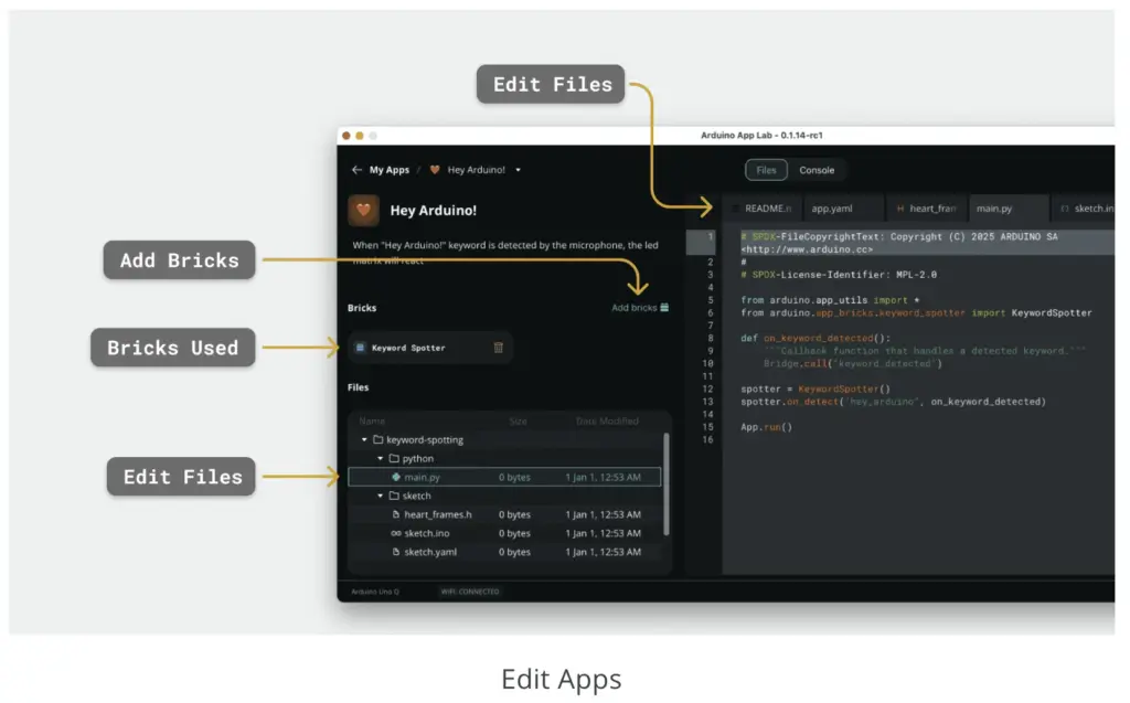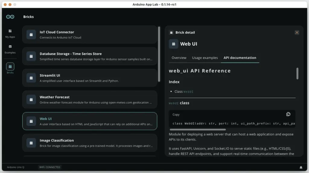 - App LabはUNO Qの公式スタート地点として案内され、SBC接続(モニタ+キーボード直挿し)やネットワーク越し開発にも対応。BricksはPythonで書かれ、Linux上で別プロセスとして動作するのがポイント。(arduino.cc)