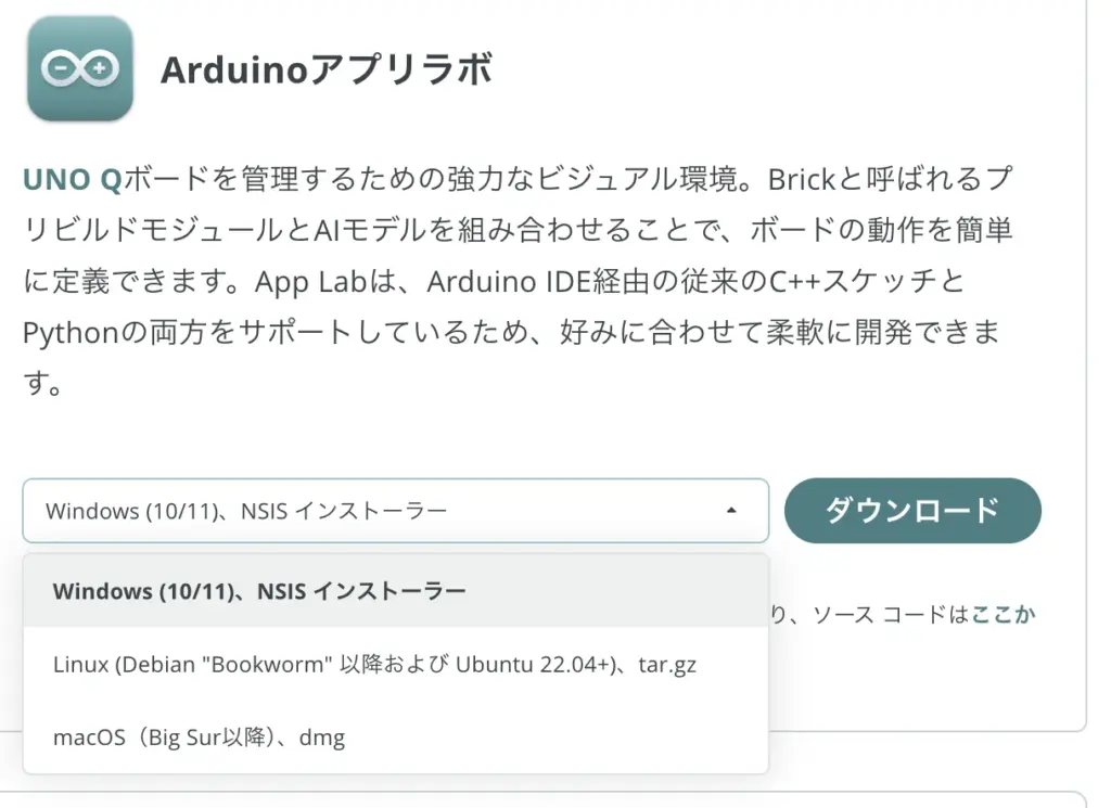 - PCにArduino App Lab(Win/Mac/Linux対応)をインストール。(arduino.cc)