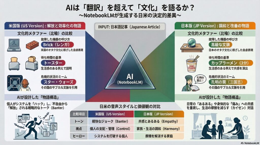 NotebookLMは、単に記事の内容を翻訳して読み上げているのではなく、それぞれの言語圏のリスナーが「あるある」と共感できる比喩表現(メタファー)に置き換えて解説しています。