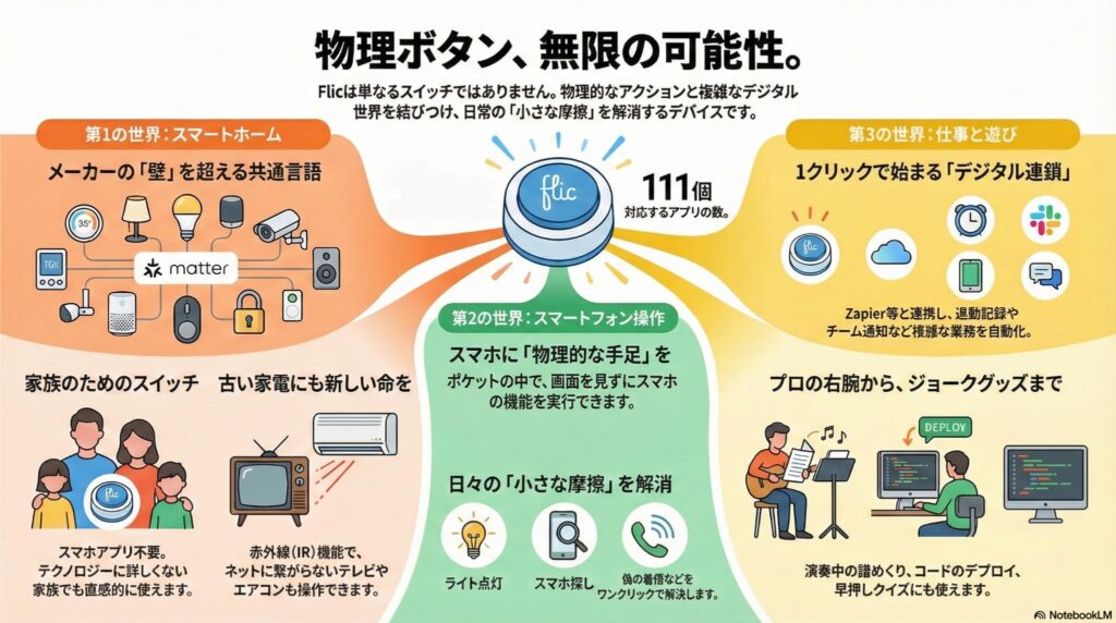 - 感想: 「スマホという『壁』にいかに風穴を開けるか」という、テック企業やシステムに対する個人の対抗手段としてFlicを捉えている印象を受けました。「ベビーシッターが電気をつけられない」といった例も、「権限(Access)」の問題として語られており、「自分の環境をいかにコントロールするか」に重きを置くアメリカ的な個人主義やDIY精神を感じさせます。